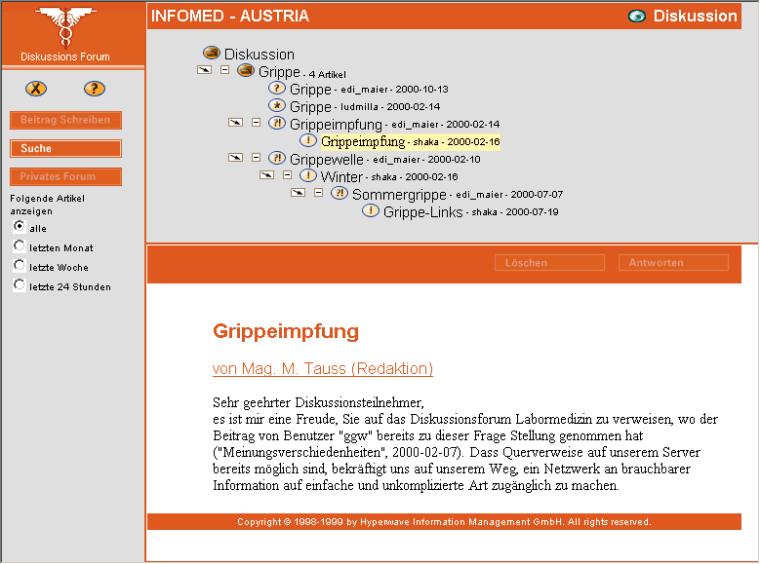 Infomed Der hier einsehbare Beitrag wird als Antwort auf eine Frage ausgewiesen, welche eine Grippeimpfung betrifft (Durch das Icon zu Beginn des Titels als Antwort ausgewiesen). Dabei wird die antwortende Partei als Link dargestellt, der zu der Visitenkarte des jeweiligen Autors führt. Weiters besteht die Möglichkeit Querverweise zwischen einzelnen Beiträgen zu erstellen. |