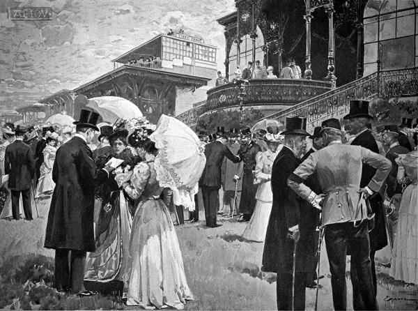 Kaiser Franz Joseph I. in der Hofloge anläßlich eines Pferderennens in der Freudenau aus dem um 1900 entstandenen "Buch vom Kaiser".