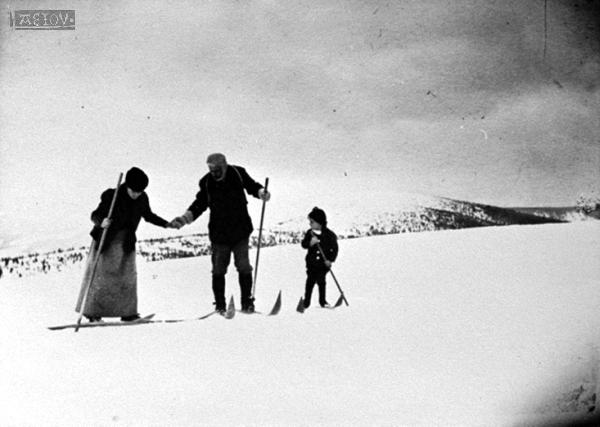 Familie beim Schilaufen auf einer Fotografie aus der Zeit um 1900.